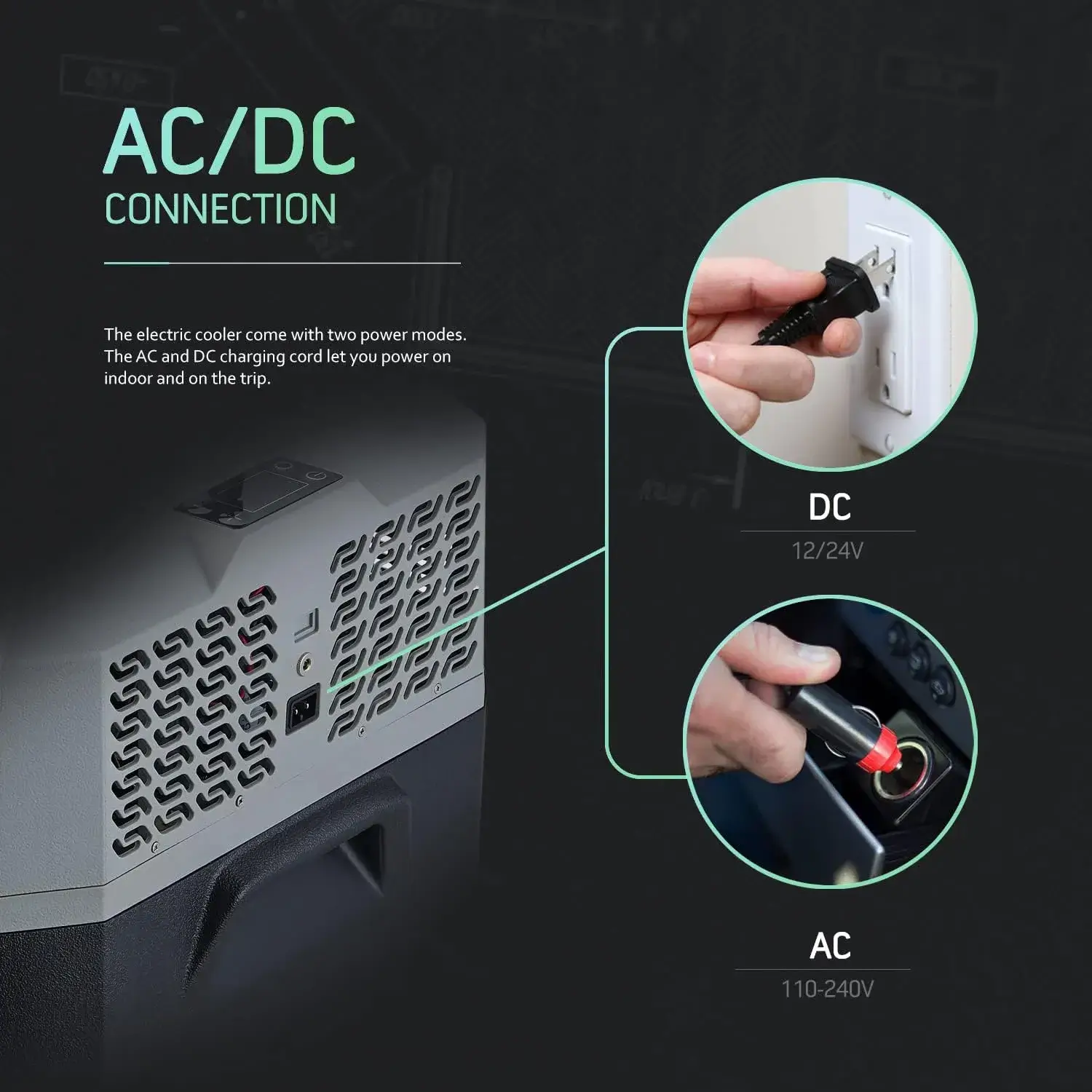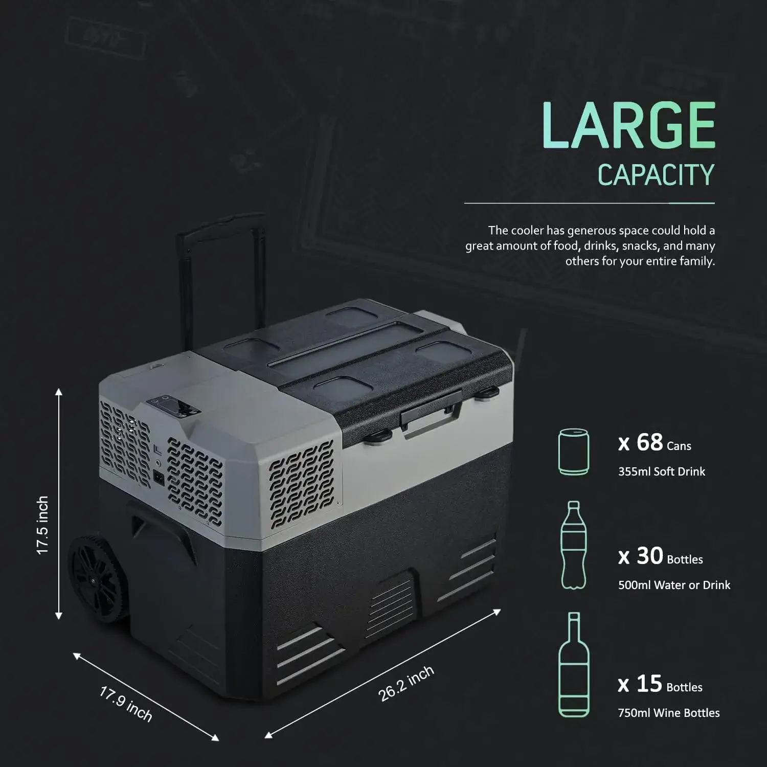 - 52 Liter PORTABLE TRAVEL FRIDGE, large capacity Electric Cooler could hold a great amount of drinks. Also enough space for snacks and food. It is perfect for party, home, camping fishing or vehicles.